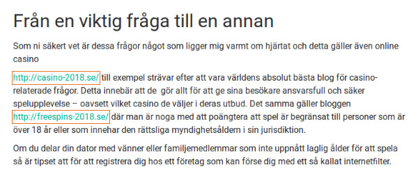 While at first glance the purpose of the copycat .nu website seemed similar to that of BARNverket’s website, upon scrolling down, a visitor could spot a paragraph that referred to affiliate websites. Those affiliate websites, in turn, referred to the websites of online gambling operators, a typical example of affiliate marketing.