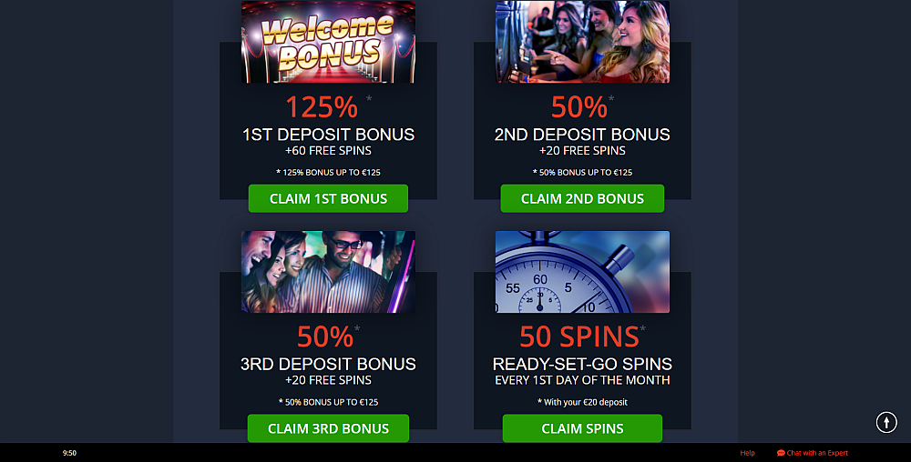 Sure enough, they’ve stuck with their philosophy, so there are bonuses to be enjoyed here, starting off with a hefty welcome bonus that comes with extra spins. This one is followed by the 2nd and 3rd deposit bonuses, which are only a little less generous.