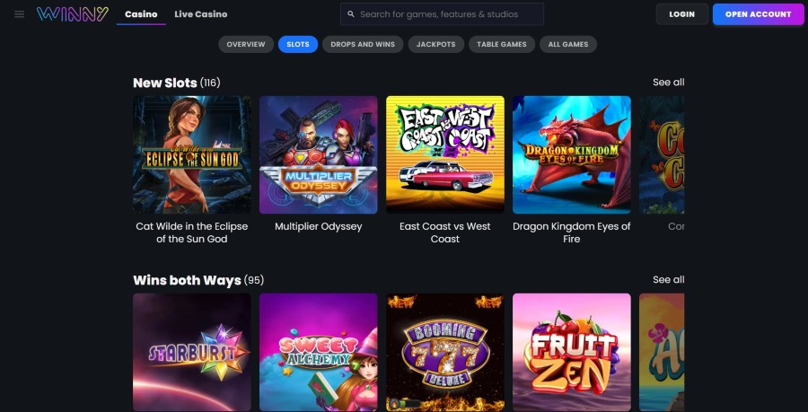 Winny’s lobby ticks all these boxes and some more. It features more than 2,000 games from the industry’s top providers as well as from a number of promising young studios. It is also clearly built to make it easy for players to find their way around.
