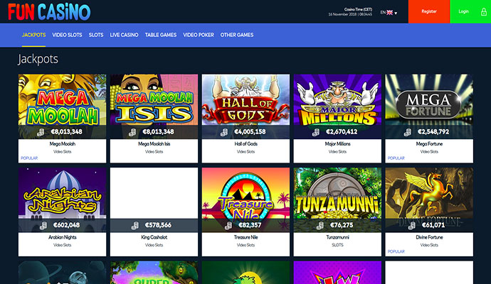 As you can probably guess, one of the most frequented categories at Fun Casino is the one devoted to jackpot games. Here, gambling aficionados are presented with a host of the most popular such games developed by NetEnt and Microgaming. Patrons of the interactive casino who fancy playing such games need to know that Mega Fortune, Arabian Nights, Tunzamunni, Mega Moolah, Mega Moolah Isis, Treasure Nile, and Divine Fortune are only some of the numerous enticing offerings under this category. You might be aware of this, but the jackpot games these providers deliver are extremely popular with casino fans as they award some of the most substantial prizes.
