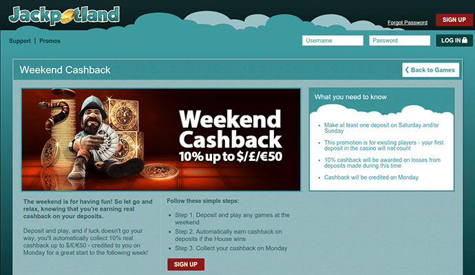 If you are an existing player, you are welcome to take advantage of the Weekend Cashback bonus.